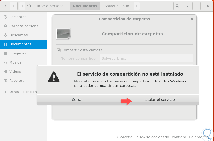 Allí podemos observar que el servicio para compartir la carpeta, Samba, no está instalado, debemos dar clic en el botón “Instalar el servicio” para que de forma automática se ejecute el proceso, podemos recibir el siguiente mensaje: