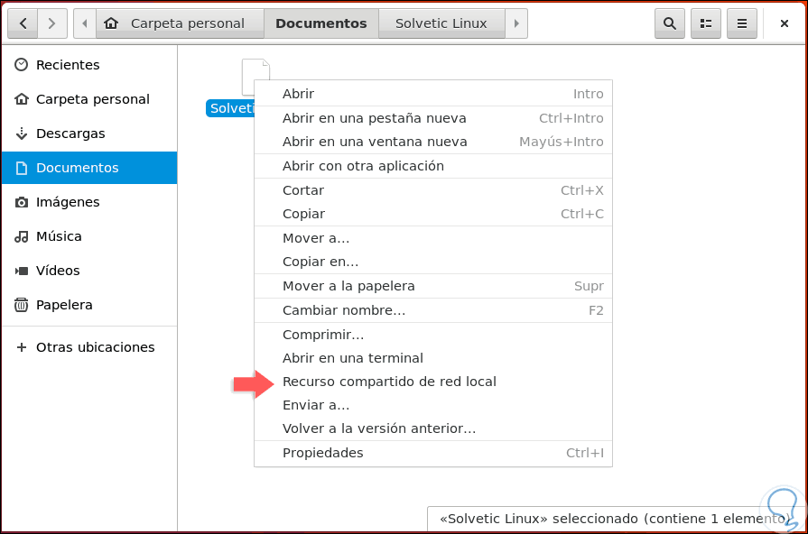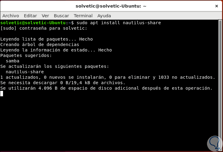 Ahora será necesario activar la opción de uso compartido de esta carpeta dando clic derecho sobre ella, si esta función no está disponible, debemos instalarla ejecutando el siguiente comando: