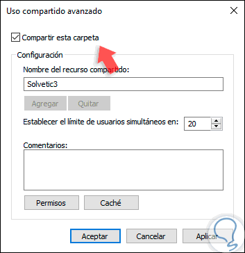 Allí podremos añadir comentarios o establecer el límite máximo de usuarios conectados a esta carpeta. Pulsamos en el botón “Aplicar y Aceptar” para guardar los cambios y veremos la ruta de dicha carpeta compartida: