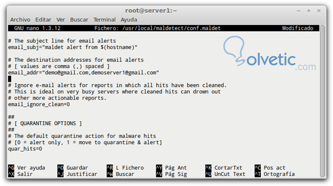 # [0 = disabled, 1 = enabled] email_alert=1También definimos si solo recibimos una alerta y movemos el fichero infectado a cuarentena para que no pueda ejecutarse.