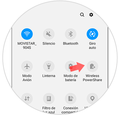 Desplaza la pantalla principal hacia abajo desde la barra de notificaciones para acceder a los accesos directos. Busca la opción de “ Wireless PowerShare” y pulsa sobre ella.