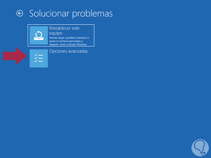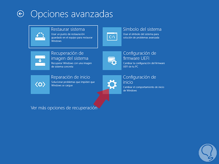 Allí seleccionamos Opciones avanzadas y en la siguiente ventana seleccionamos la opción Configuración de inicio: