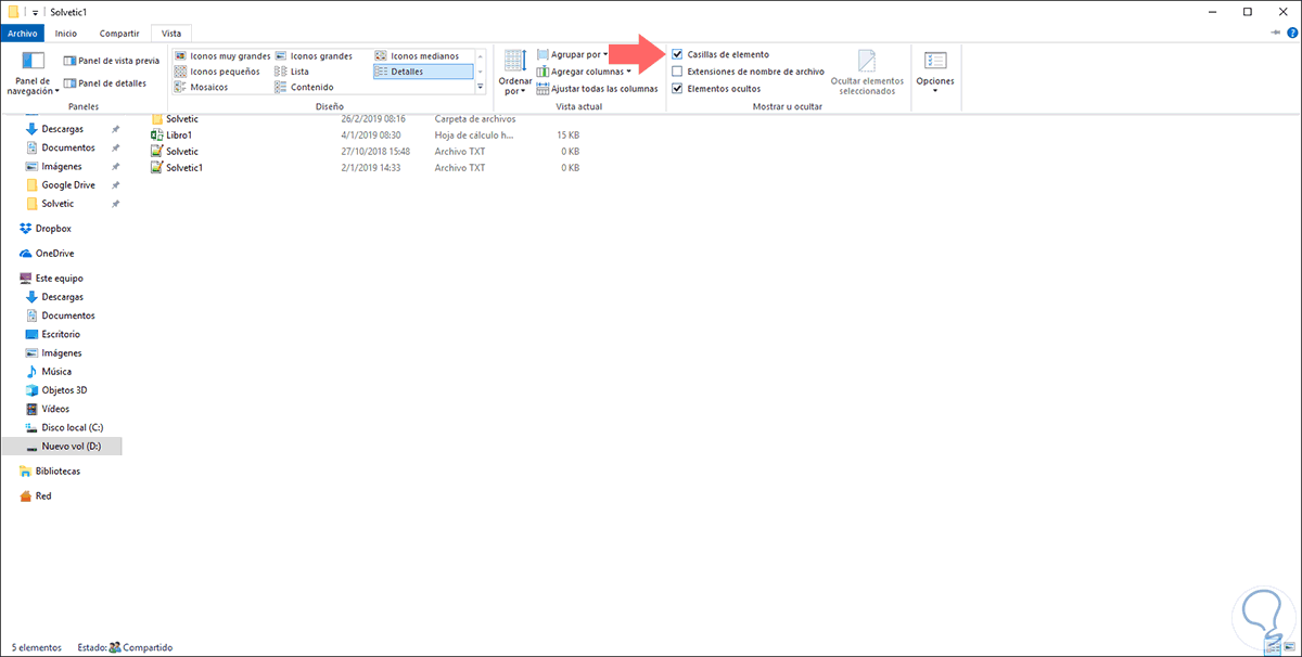 Otra de las opciones por las cuales podemos ver esta casilla es que en algún momento pudimos activar la casilla de elementos en el explorador, para verificar esto y desactivarla si es el caso, debemos ir al Explorador de archivos de Windows 10 y allí ir al menú Vista y en el grupo Mostrar u ocultar comprobar el estado de la opción Casillas de elemento. Si esta activa simplemente debemos desactivarla para corregir el error.