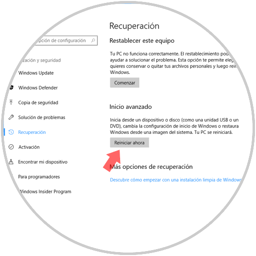 Allí damos clic en el botón Reiniciar ahora ubicado en la sección Inicio avanzado y se desplegara lo siguiente: