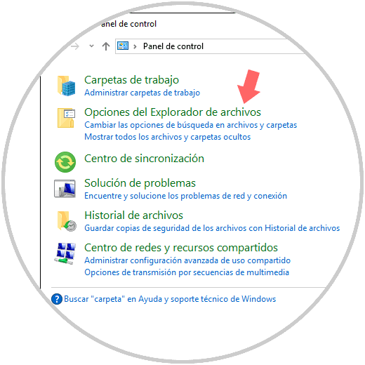 Para usar este método podemos acceder al Panel de control y en el cuadro de búsqueda ingresar el termino “carpeta” y en los resultados desplegados seleccionar Opciones del Explorador de archivos: