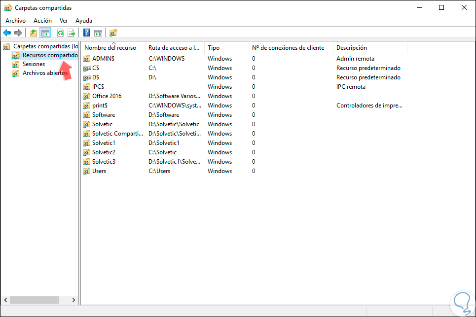 Pulsamos en Aceptar o Enter y esto desplegara una ventana de la consola MMC con la información detallada de nuestras carpetas compartidas en Windows 10 en la sección “Recursos compartidos”: