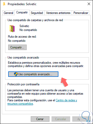 En la ventana desplegada iremos a la pestaña “Compartir” y allí damos clic en el botón “Uso compartido avanzado”: