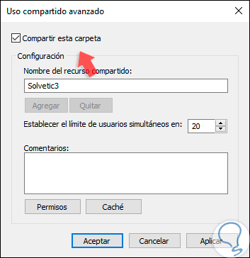 En la ventana abierta activamos la casilla “Compartir esta carpeta” y procedemos a asignar el nombre deseado para esta. Pulsamos en Aplicar y Aceptar para guardar los cambios. Esto es bastante útil cuando múltiples usuarios deben compartir información entre si pero es posible que llegue el momento en el cual olvidemos cuales carpetas han sido compartidas en Windows 10 y será necesario obtener esta información ya sea por temas de auditoría, soporte o control.