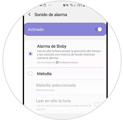 Si pulsamos en sonido de alarma podremos elegir entre una alarma de Bixby con sus configuraciones propias que te puede llegar la hora en alto, leer en alto la hora solamente, o bien una melodía que podemos personalizar.