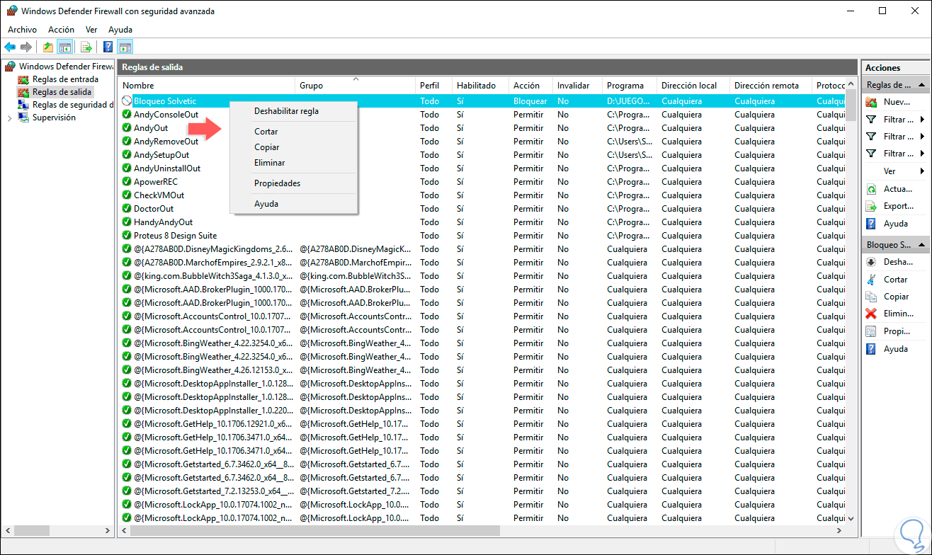 Ahora cuando ejecutemos ese archivo bloqueado no recibiremos ninguna respuesta de instalación ya que se ha bloqueado su conexión con la red. Al dar clic derecho sobre la regla creada podremos realizar acciones como: