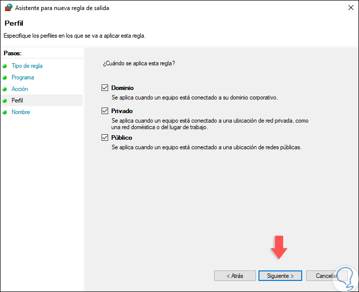 En la siguiente ventana debemos definir en qué ambientes se ha de aplicar esta regla, por razones de seguridad seleccionamos todos los ambientes disponibles: