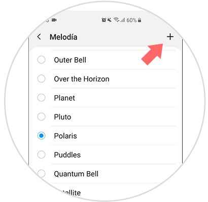A continuación se nos abrirá una nueva ventana donde podremos elegir la melodía que queremos. Tenemos la posibilidad de elegir un tono por defecto o bien pulsar en el “+” y seleccionar una canción o tono nuestro almacenado en el teléfono.