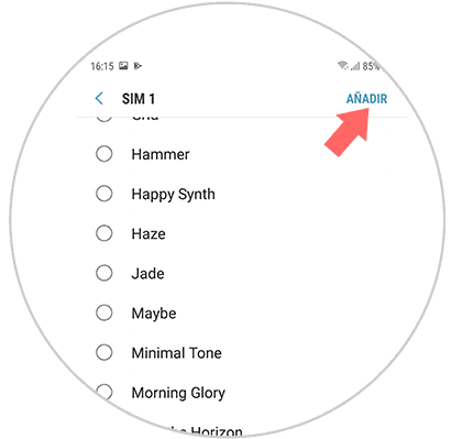 Verás que aparecen una serie de tonos predeterminados en el teléfono. En este caso debes seleccionar en la parte superior “Añadir” para poder incluir la canción que tienes descargada en el móvil y seleccionarla como tono de llamada.
