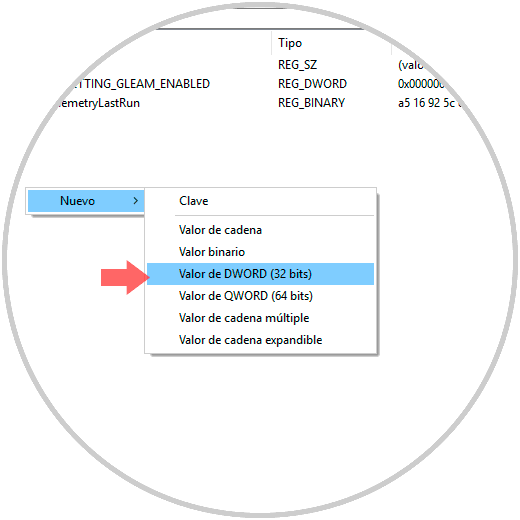 En el costado derecho daremos clic y seleccionamos la opción Nuevo / Valor de DWORD (32 bits). Este nuevo valor DWORD será llamado NOC_GLOBAL_SETTING_GLEAM_ENABLED.