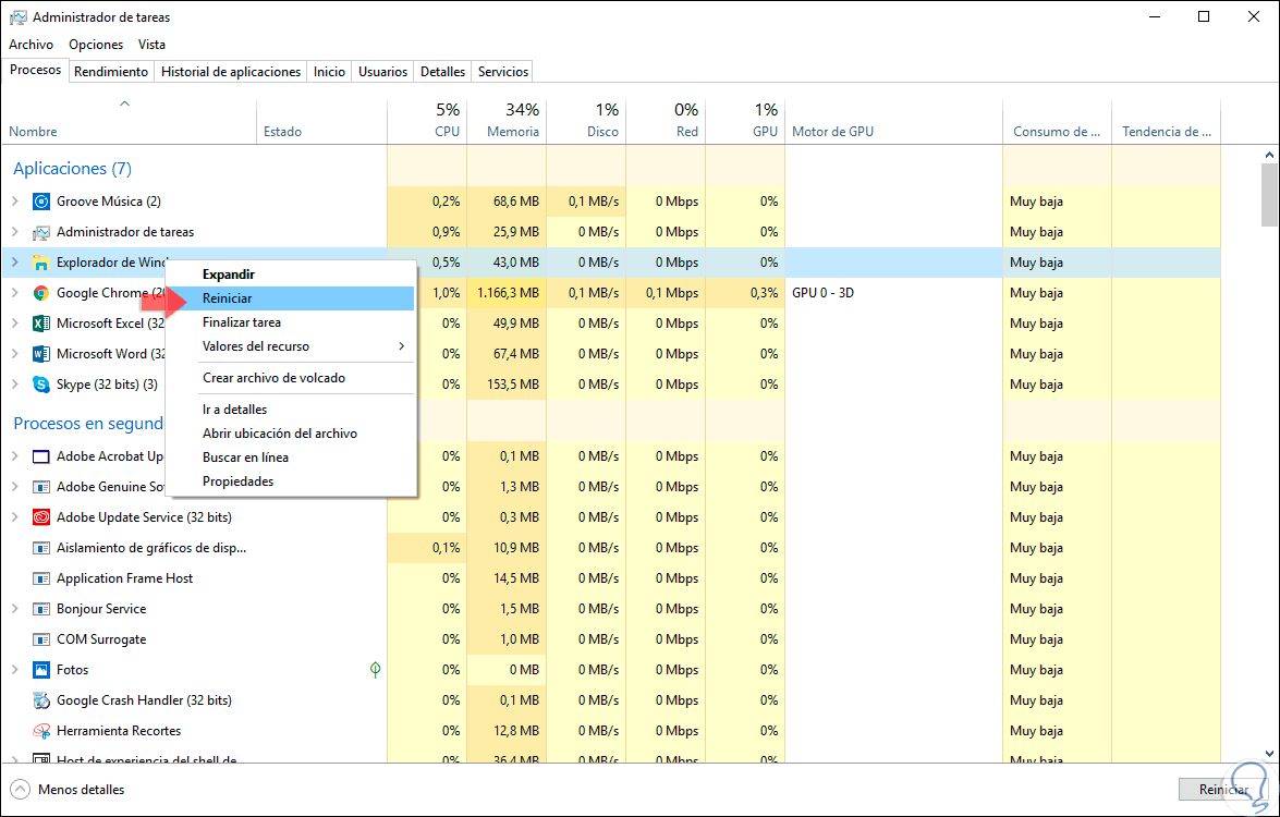 Ahora accedemos al Administrador de tareas y en la pestaña Procesos debemos reiniciar el Explorador de Windows usando alguno de los siguientes métodos: