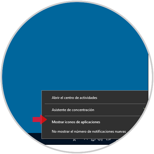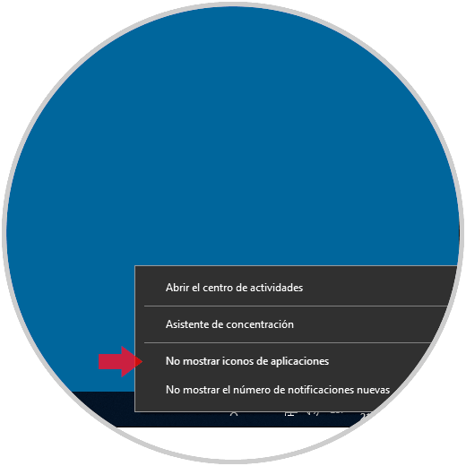 Debemos dar clic derecho en el icono del Centro de Actividades ubicado en la esquina inferior derecha de la barra de tareas y en las opciones desplegadas seleccionar la opción “No mostrar iconos de aplicaciones”: