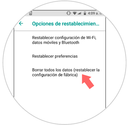 Aquí, en la nueva pantalla, pulsa en la última opción “Borrar todos los datos (restablecer datos de fábrica)”.