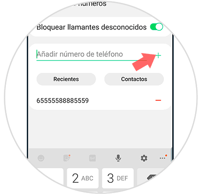 Desde aquí podremos añadir el número que queremos bloquear escribiéndolo y pulsando en el “+”. También puedes elegir el contacto desde la opción de “Contactos”.