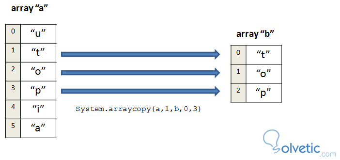 Como vemos en una sola linea resolvemos el problema, el método recibe en su primer argumento el array que vamos a copiar, luego recibe la posición inicial desde donde vamos a copiar, luego el array destino de la copia, su posición inicial y por último la longitud de la copia: