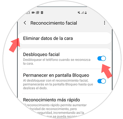 Para finalizar, simplemente pulsa en la opción de “Eliminar datos de la cara” en caso de que desees limpiar el registro de esta característica en tu Samsung Galaxy S10 Plus. Sin embargo, si deseas deshabilitar la función, entonces solo ve a la pestaña de “Desbloqueo facial” y desliza la barra que ahí podrás observar hacia la izquierda.