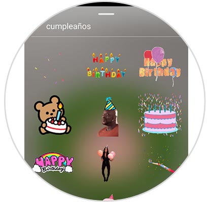 Ahora selecciona el icono de Stickers con la foto o el texto que quieres poner en la Storie. Selecciona aquellos de cumpleaños que quieras.