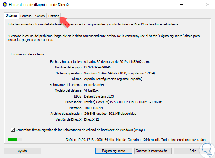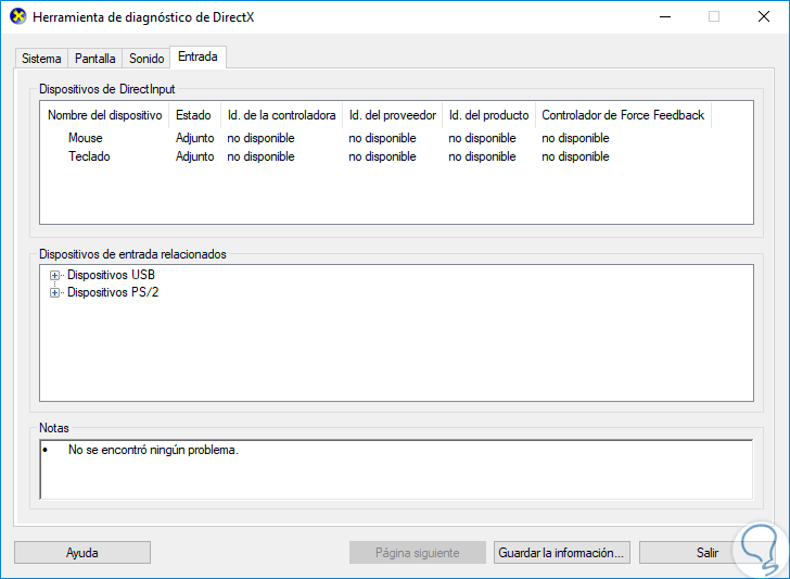 Allí encontramos un completo resumen de los aspectos involucrados en DirectX, en la pestaña Entrada podemos detectar aspectos de la cámara web. En caso de no detectar ninguna cámara web debemos recurrir a aspectos más técnicos para validar su conexión.