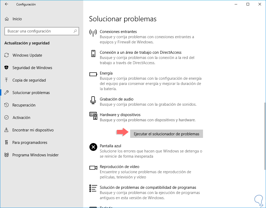 Allí debemos ir a la sección “Solucionar problemas” y en la parte lateral derecha ubicaremos la línea “Hardware y dispositivos”: