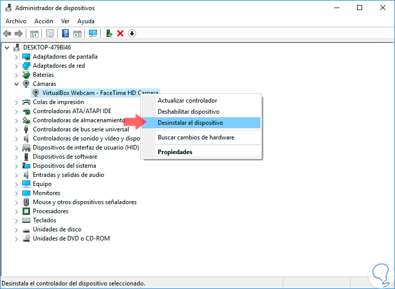 En la ventana que será desplegada vamos a la sección “Cámaras”, damos clic derecho sobre la cámara en conflicto y allí seleccionamos la opción “Desinstalar el dispositivo”: