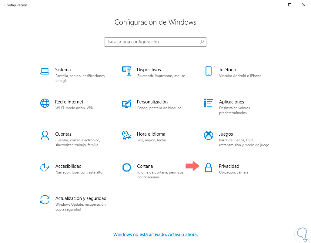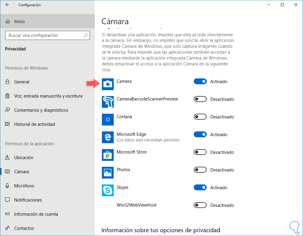 Seleccionamos la categoría “Privacidad” y en la nueva ventana desplegada iremos a la sección “Cámara” e iremos a la sección “Permisos” de la aplicación donde debemos confirmar que el interruptor de Skype esté activo para el uso de la cámara. Este es el paso inicial a realizar.