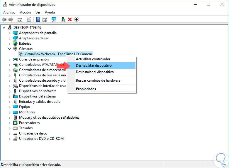 Este es un proceso simple mediante el cual deshabilitamos y reactivamos de nuevo el controlador con el fin de que el sistema refresque los servicios de este, para ello, desde el Administrador de dispositivos, daremos clic derecho sobre el controlador de la cámara y esta vez seleccionamos la opción “Deshabilitar dispositivo”. Luego de esto, damos de nuevo clic derecho y esta vez seleccionamos “Habilitar dispositivo”, validamos que la cámara funcione de la forma esperada.