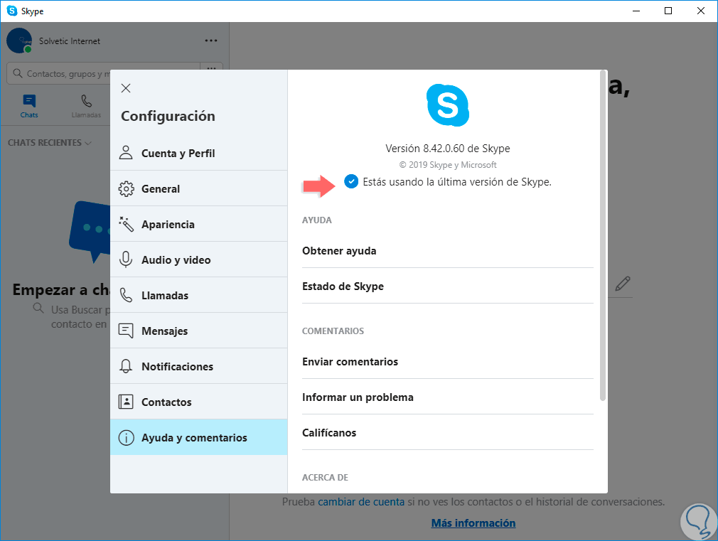 Para validar si usamos la última versión disponible de Skype, accedemos a la app y desde el menú Más seleccionamos la opción Configuración y posteriormente vamos a la sección Ayuda y comentarios, allí veremos que versión de Skype estamos usando. En caso de no estar actualizada, el proceso de actualización será ejecutado de forma automática.