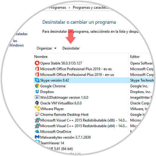 Allí ubicaremos la aplicación Skype y damos clic en el botón Desinstalar ubicado en la parte superior: