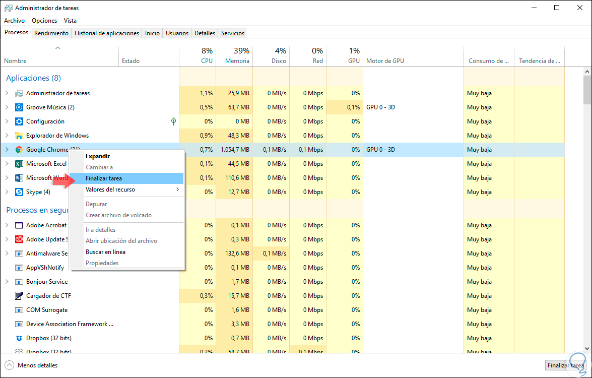Para esta tarea iremos al “Administrador de tareas” dando clic derecho en la barra de tareas y allí seleccionado la opción “Administrador de tareas”, luego, en la pestaña “Procesos” y allí ubicar el proceso, dar clic derecho sobre él y seleccionar la línea “Finalizar tarea”: