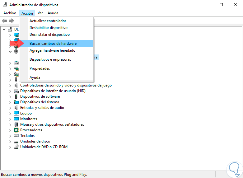 Una vez realizado esto, iremos al menú “Acción” y allí seleccionamos la opción “Buscar cambios de hardware”. Esto detectará que el controlador de la cámara no está disponible y se procederá con su instalación.