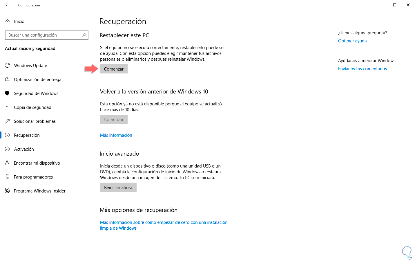 Para lograr esto, iremos a la siguiente ruta. Allí damos clic en el botón “Comenzar” ubicado en la sección “Restablecer este PC” y allí seguiremos los pasos del asistente.
