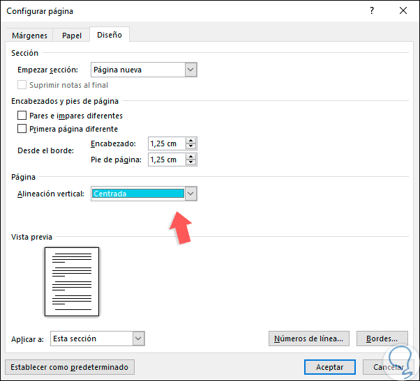 Esto desplegará el asistente de configuración, allí debemos ir a la pestaña Diseño y allí ubicaremos la sección “Página” y en el campo “Alineación vertical” desplegamos sus opciones y seleccionaremos “Centrada”: