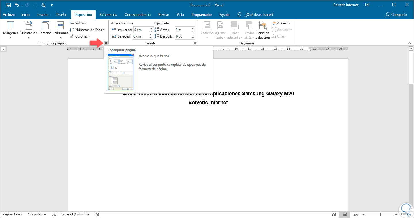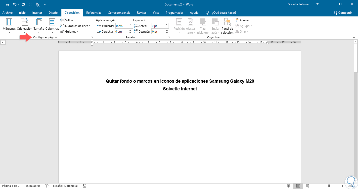 Hasta el momento vamos bien ¿verdad?, pues bien, ahora el siguiente paso es ubicar el cursor en la página donde está el título e ir de nuevo al menú “Disposición y esta vez dar clic sobre el icono inferior izquierdo llamado “Configurar página”: