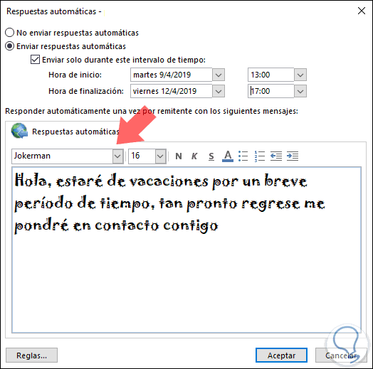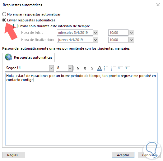 Si deseamos establecer un periodo de tiempo para el envío de la respuesta, activaremos la casilla “Enviar solo respuestas automáticas durante este periodo de tiempo” y asignaremos el rango deseado.