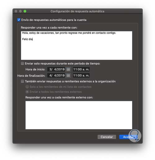 Como una opción adicional, Outlook 2019 en macOS nos da la oportunidad de enviar mensajes de vacaciones a usuarios externos, para ello activamos la casilla “También enviar respuestas a remitentes externos a la organización” y asignar el respectivo mensaje. Una vez definido esto pulsamos en Aceptar para aplicar los cambios.