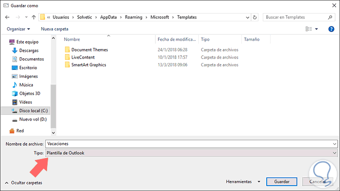 En la ventana que será desplegada, debemos asignar el nombre deseado a la plantilla y en el campo “Tipo” elegir la opción “Plantilla de Outlook”: