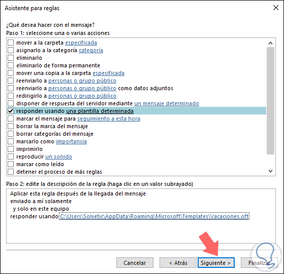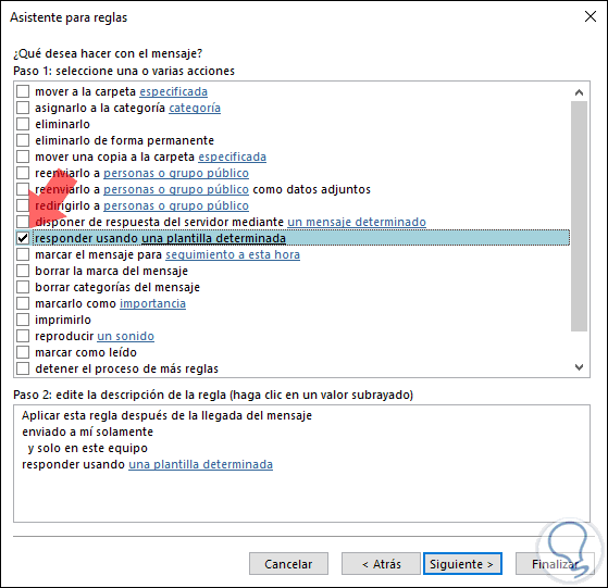 Podremos seleccionar todas las deseadas, luego de esto, damos clic en Siguiente y allí activaremos la casilla “Responder usando una plantilla determinada”: