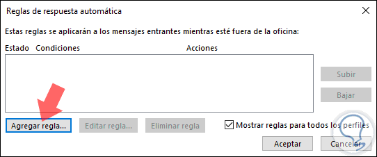 En la parte inferior encontramos la opción Reglas, al pulsar allí será desplegado lo siguiente. Pulsamos sobre el botón "Agregar regla"