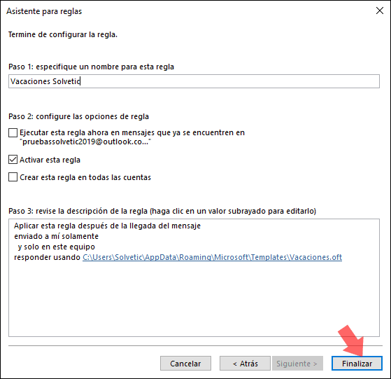 Una vez procesado esto, damos clic en Siguiente y podremos dar un nombre a la regla así como activarla, aplicarla para todos los mensajes ya existentes o hacerla un estándar para todas las cuentas de Outlook 2019: