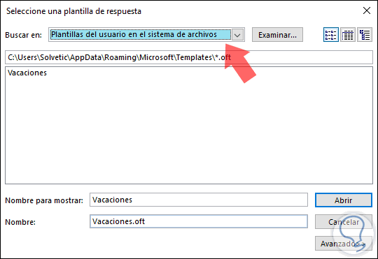 En la parte inferior veremos resaltada la línea “una plantilla determinada”, damos clic en ella y luego seleccionamos la opción “Plantillas del usuario en el sistema de archivos” en el campo “Buscar en” ubicado en la parte superior:
