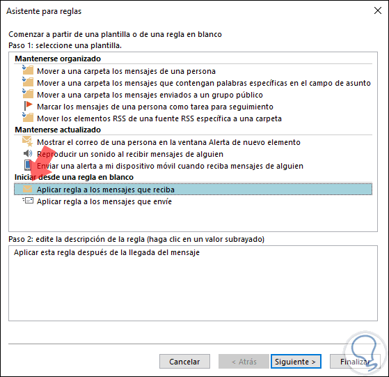 Será desplegada la siguiente ventana, allí iremos a la sección “Iniciar desde una regla en blanco”, luego seleccionamos la opción “Aplicar regla a los mensajes que reciba”: