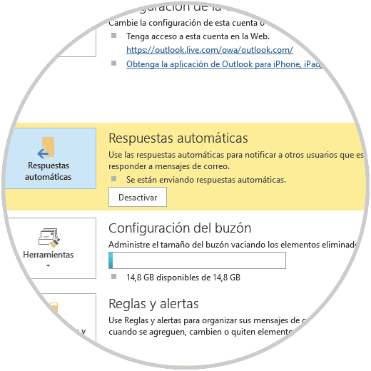 Definido esto pulsamos en Aceptar para guardar los cambios y podremos ver que la sección “Respuestas automáticas” estará resaltada, esto indica que allí existe una regla: