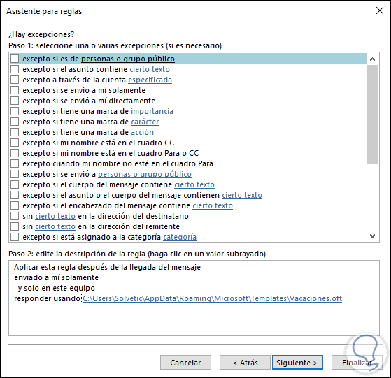 Damos clic en Siguiente y en la próxima ventana será posible, si aplica, crear excepciones a la regla:
