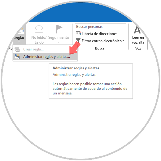 Una vez realicemos este proceso, vamos a crear una nueva regla la cual tendrá como tarea replicar automáticamente el mensaje creado, para lograr esto iremos al menú Inicio y en el grupo “Mover” pulsamos en la opción “Reglas” y allí seleccionaremos la opción “Administrar reglas y alertas”: