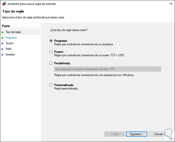 Por defecto el Firewall de Windows 10 está integrado con numerosas reglas ya establecida las cuales debería aportar la seguridad necesaria. Pero en oportunidades es posible que deseemos crear nuestras propias reglas en base a los requerimientos actuales y esto es posible gracias a la creación de reglas tanto para programas, puertos, personalizada o bien usar alguna de las predefinidas. Estas reglas pueden ser aplicadas tanto para dominios, red privada o red pública.