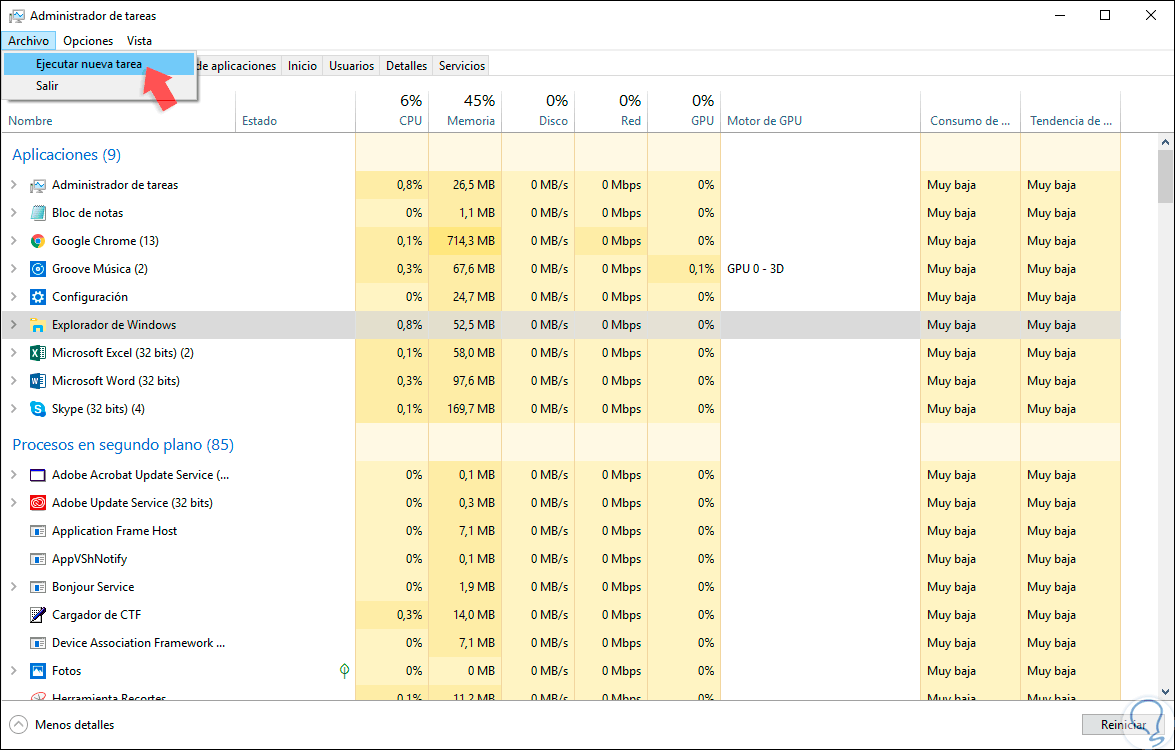En caso de que usemos la opción de “Finalizar tarea”, debemos ir luego al menú Archivo y allí seleccionar la opción “Ejecutar nueva tarea”: